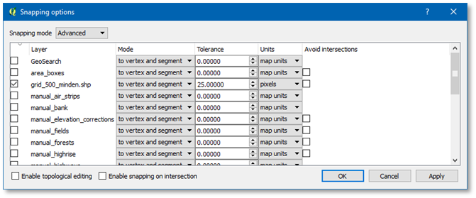 Drawing fields into partial forests goes easier when we are also snapping to the forest layer. So, use “Settings” menu, “Snapping Options”, and enable snapping to manual_forests, with tolerance set to 25 pixels (as units), and Mode set ‘to vertex’.