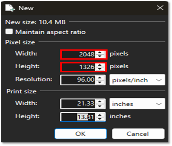 Set the Canvas size (e.g., 1920 x 1080 px) or match the map image, since the map I’m using is 2048 x 1326. Enter these dimensions in the width and height fields. Refer to Figure 5.1.1: Set Canvas Size