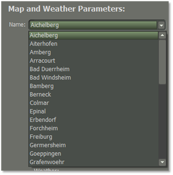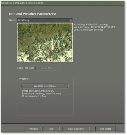 After clicking the "Next" button, the initial window that appears is the Map and Weather Parameters page. This page allows users to select both the map and the potential weather conditions for the scenario. The Map and Weather Parameters window is seen in Figure 4.