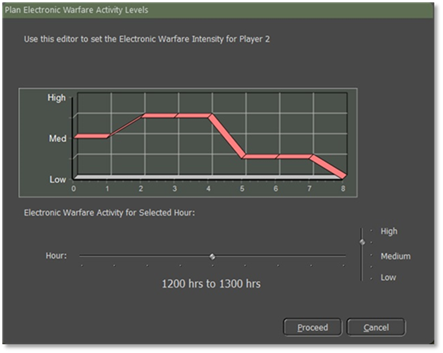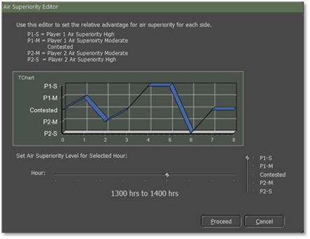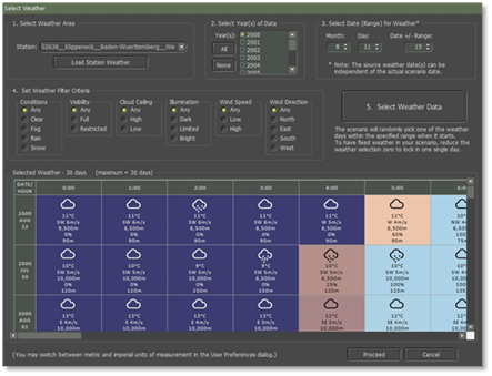 The Weather Selection editor allows you to set up a range of possible historical weather patterns or you can tailor the weather to meet your needs. This information is then used to dynamically generate the weather for the scenario and is used to provide the weather forecast seen in the game so players can get an idea of how the weather will impact the fight.