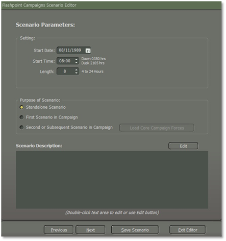 These set the date, time, and duration for the scenario. This is the starting point of making a new scenario standalone or for a campaign.