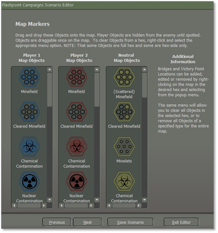 The markers in the three lists represent markers by the player side and a set of neutral markers in yellow that can affect all units on the map. Side-specific markers in Blue for side one or Red for side two only impact the other side when a marker is encountered.