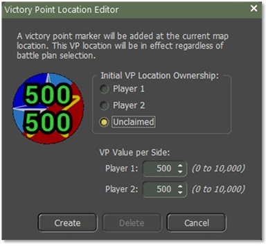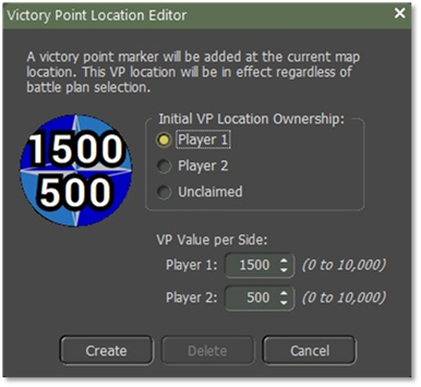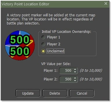 - VP Value – A new feature in Southern Storm is the ability to have split value VPs to allow you to better shape the mission objectives by having a location have more value and AI weight for a side as illustrated in Figure 15. You can enter a value or use the value spinners to set each of the values.