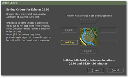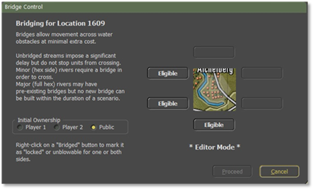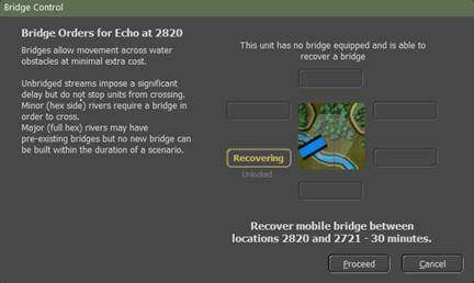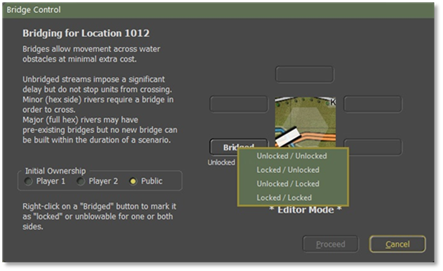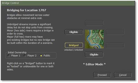 To add a bridge, you need to select a hex next to a water obstacle and then right-click to bring up the Popup Menu, and then select “Bridge Controller” as illustrated in Figure 21 to open the dialog.