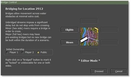 While the game engine will automatically add all required road and rail bridges to the map, you still can “blow up” bridges to show engineering actions before a battle or even add additional temporary bridges (again from pre-game engineering actions) to possible crossing areas on the map.