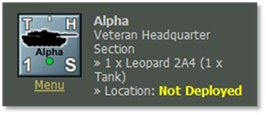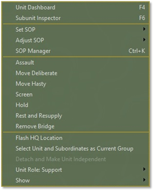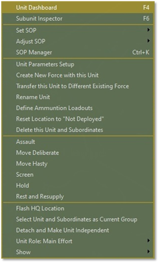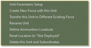 After creating your forces, you may need or want to make changes to the ammo loadout to your units. First, select “Menu” which is located under the unit icon. To do that you open the Unit Dashboard and select “Define Ammunitions Loadout” as shown in Figure 110.