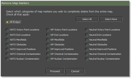 These functions include map obstacles like mines, NBC contamination, fortifications, smoke, bridges, and Victory Point (VP) markers. The dialog shown below shows most of those markers.