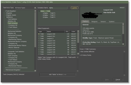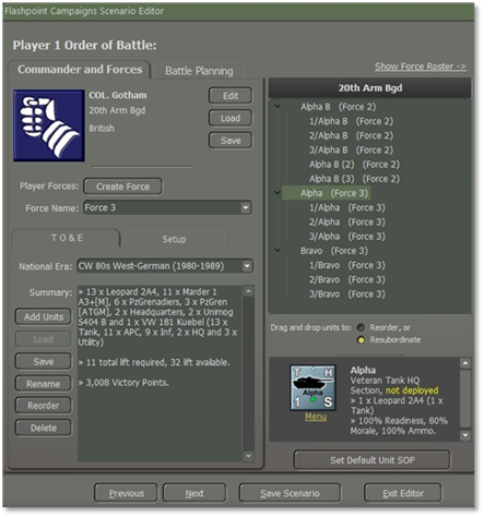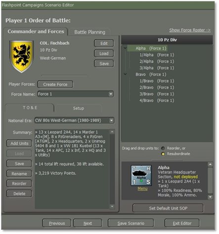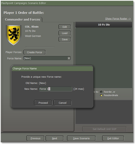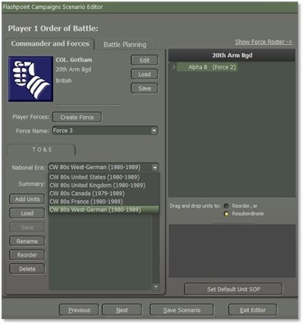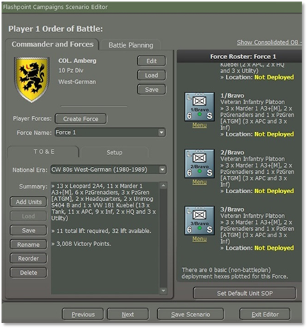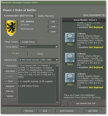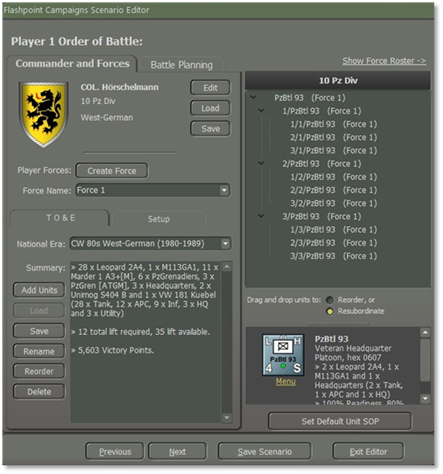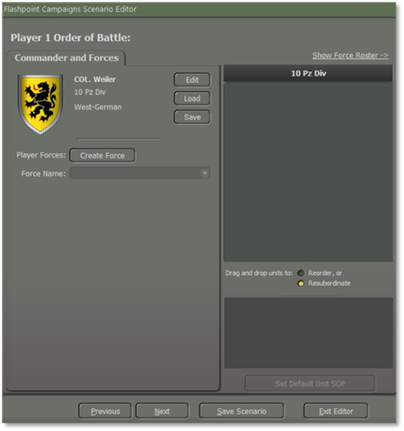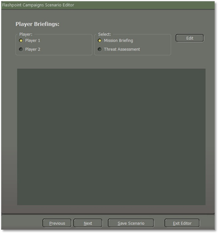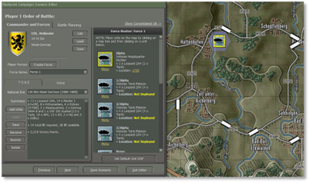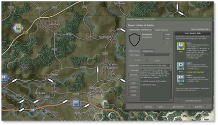 At the bottom of the first panel is the “Scenario Description” text box. The scenario description is used to tell players the background information that sets up the battle, but not mission specifics for each side. That is done later in the editor.