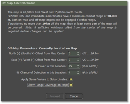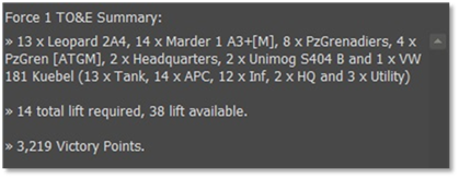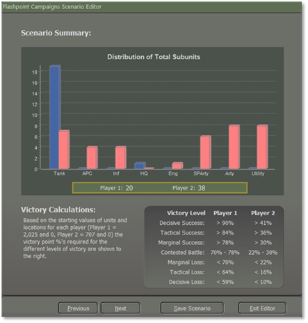 The dialog below outlines the Distribution of Units and the breakdown of Victory Point scoring for the scenario as designed. The breakdown of the dialog is as follows as shown in Figure 134:
