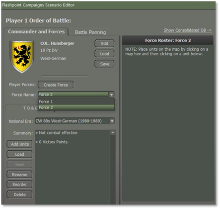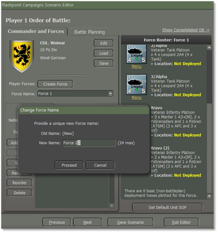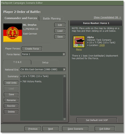 We will also add a battle plan for each side, but that information can be found in FM05: Battle Planning. You will need to open that document when the time comes to see all the functionality of the Battle Planning process.