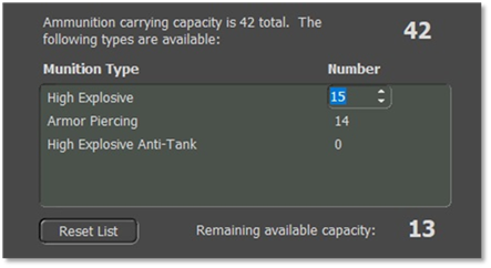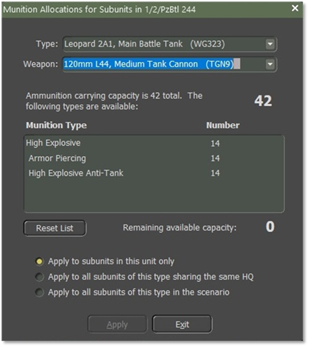 5. We know that the total amount of ammo for this Leopard 2A1 is 42. But I want to change the amount of ammo for, for example, I want to remove the High Explosive Anti-Tank rounds from 14 to 0. To do that you must highlight the type of ammo and then highlight the number of rounds in this case 14. Using the drop-down arrows, you can make the changes. I elected to reduce it to 0. When doing so the “Remaining available capacity will change from 0 to 14 as shown in Figure 116. Select the ammo on which you want to add and then select the number of rounds and up and down arrows which will add the amount of ammo and the remaining available capacity will change.