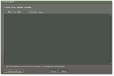 The mission briefings should follow the scenario narrative that you wrote in the Scenario Description panel, but you do not need to repeat all that information. Focus on providing the side specifics details.