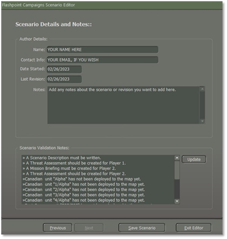 1. In the Author Details area, you can enter your Name (real name and forum handle), Contact information (an email address if you want folks to contact you or leave it blank), Date Started (you should populate with the date you start working on the scenario), Last Revision (date auto populates with today’s date), Notes (Any info about the scenario or changes made in the revision).