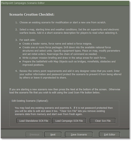 It would help if you took a minute and read through the Scenario Creation Checklist on the starting page of the dialog for some critical information on using the editor.