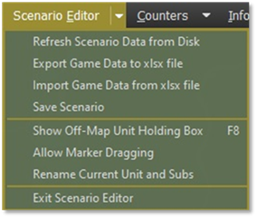 Refresh Scenario Data from Disk – Use this menu item to update all the unit data in the scenario if the game data is updated. See Section 7 below for details on how to use this function. It would help if you had a scenario loaded to activate.