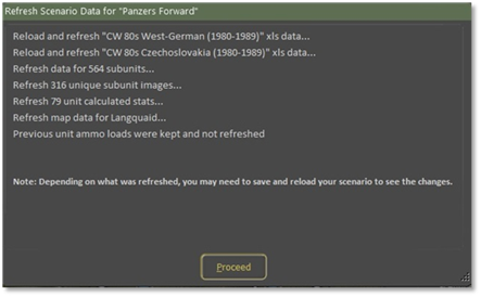 After you select the “Yes” button a popup screen will appear loading the new data. For this example, we refresh with the scenario “Panzer Forward” as shown in Figure 152, and then select the “Proceed” button.