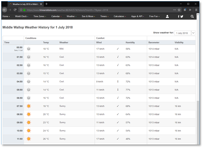 Let’s browse to www.timeanddate.com, and search for Middle Wallop, bringing us to https://www.timeanddate.com/weather/@2642574. Here, we can ask for last weeks’ weather: https://www.timeanddate.com/weather/@2642574/historic. And select July 2018 as the month: https://www.timeanddate.com/weather/@2642574/historic?month=7&year=2018. Next, we click July 1 to get detailed weather: