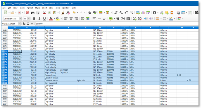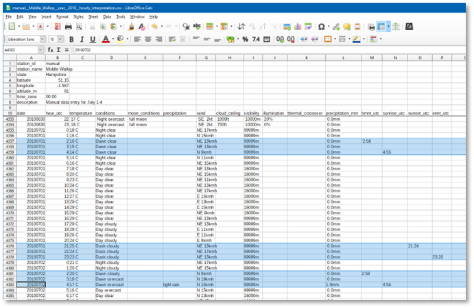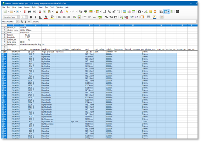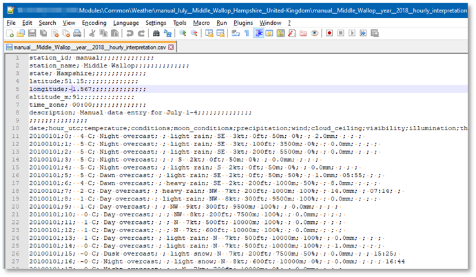 Let us say, we want to use pseudo-random July weather for the Salisbury Plains UK area, with three different weather days being sufficient for pseudo-random weather. Which means we need to obtain and enter 3 x 24 consecutive hours + 23 hours is approximately 96 hours of weather data.