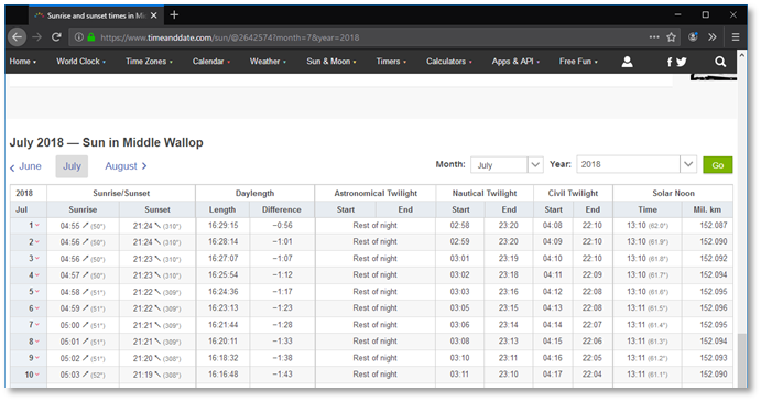 Next, on the same web site, we can find the dawn and dusk times. Click the ‘Sun & Moon’ drop down below the Middle Wallop banner, then select ‘Sunrise & Sunset’. It brings you to: https://www.timeanddate.com/sun/@2642574. In the lower part of the page, change the month and year to July 2018 (https://www.timeanddate.com/sun/@2642574?month=7&year=2018).