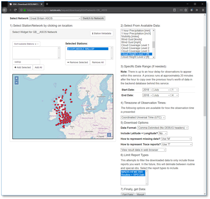 For Middle Wallop, UK, select the Great Britain ASOS network, and switch to that network: https://mesonet.agron.iastate.edu/request/download.phtml?network=GB__ASOS. Next, search for Wallop or EGVP, and select the EGVP Middle Wallop station. Finally, select the ‘Cloud Height Level 1 [ft]’ column, and set the date range to 2018 July 1 – 2018 July 5 (not July 4!), using the local UK (GMT/UTC time zone), and press ‘Get Data’.