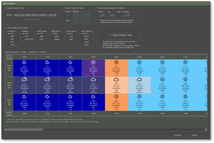 Press Proceed to use a pseudo-random selection from these 3 days of Salisbury Plains weather in your scenario.