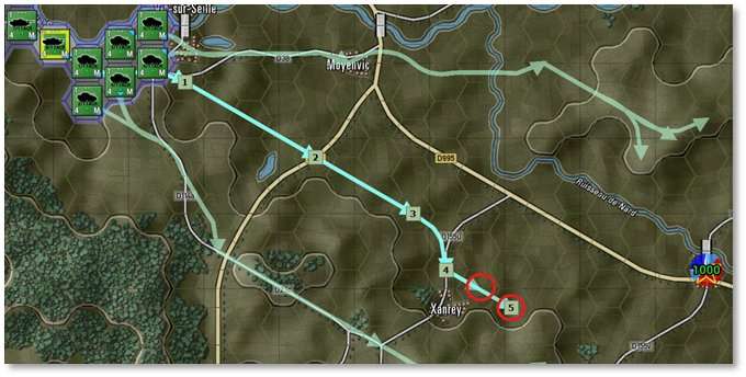 Next, we will select the following waypoints to move these Tanks just East of Xanrey and select Hold for the Arrival order. Then select one of the tanks and position final waypoints out as seen below.