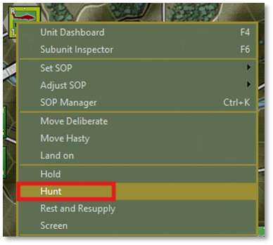 Right-click on the 11/AH64 unit and then select the Hunt order. Hunt is an order specific to helicopters that has them dance around and use terrain masking while looking for enemy targets to engage. This movement is designed to reduce their exposure to enemy air dense units or ground fire that could take them out.