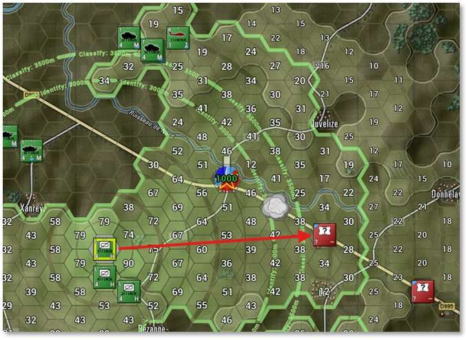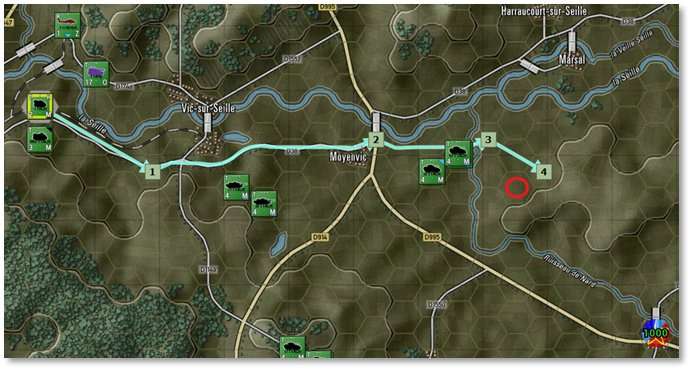 Once the movement order is issued, the troops mount up, and the counter image changes from the NATO Scouts to the M3 Bradley and the movement type goes from L (Leg) to T (Tracked) as seen below.