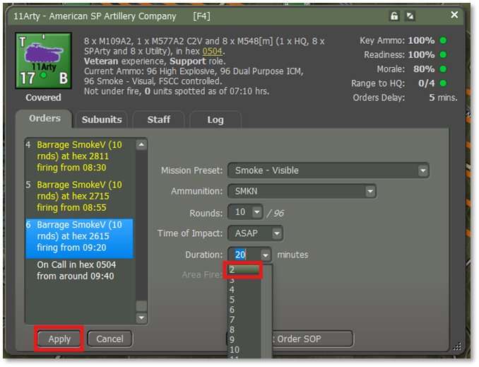 Select 11Arty. Right click on the unit and then select Barrage and then select Smoke – Visual Blocking. This will open the Plot Targets dialog.