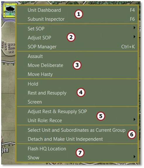 The sixth section of the menu contains a shortcut to Select Unit and Subordinates as Current Group which selects the formation from a single selected unit. Detach and Make Unit Independent removes the selected unit from the formation and HQ it is under and places it on its own. For most subunits, it is better and safer to use the Order of Battle Tree to do resubordinations. See Section 20 below for more on using the Order of Battle Tree for this.
