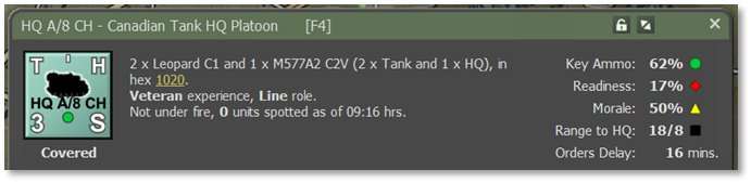 - The stats on the right shows the unit’s Key Ammo level (primary weapons), Readiness, Morale, Range to HQ (local HQ for the unit), and any Orders Delay. 100% indicates high levels of each factor and 0% is completely ineffective. Range is indicated with how many hexes away the selected unit is from its HQ (e.g., 18 in the example below) versus how many hexes from the HQ the command range reaches (e.g., 8). See Section 18.4.1 below for how headquarters support units in their command.