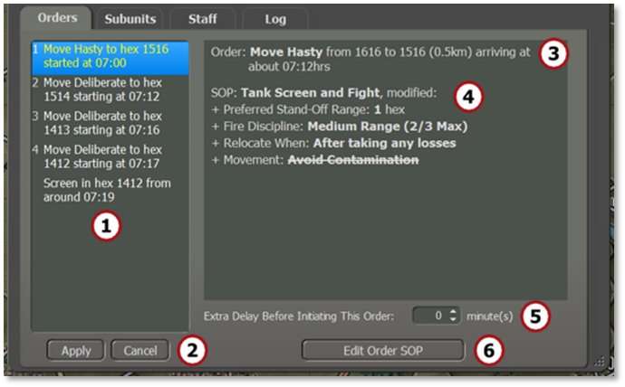 - This window lists the unit’s orders noting the type of order, the hex location of the order (four-digit column/row grid coordinates), and the estimated start time of the order execution. Left-click to select any of the orders to view their SOP information. Right-click to open a popup menu to change the selected order. The selection is context-sensitive based on the initial order, as seen below.