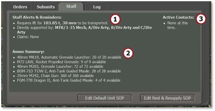 Staff Alerts and Reminders displays alerts for any weapons that are out of Ammo, any artillery units that can support this unit (if available), any unique unit capabilities, and any claims of destroyed enemy units.