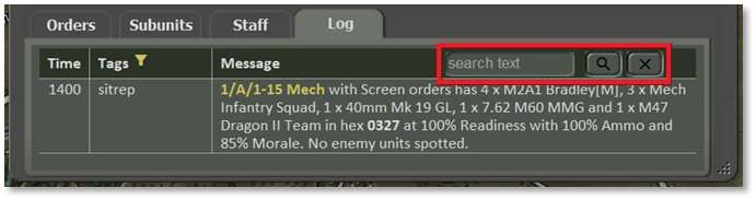 The top right corner of the Log tab hosts a search field that filters the display to messages involving only the desired text (e.g., searching for a particular unit or vehicle type). Search is case-sensitive.