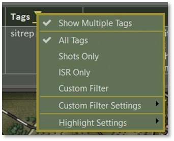 Choose which group of messages you would like to see by selecting All Tags, Shots Only, ISR Only, or Custom Filter. Selecting one of these options does not change how many tags are shown, as above. To see just the messages that involve bullets firing, select Shots Only. To see only messages about the enemy from Intelligence Surveillance Recon, select ISR Only.