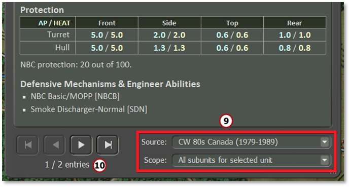 Under Scope, select different groups of subunits to view in each tab’s details including All Subunits For Selected Unit, All Subunits For This Scenario, or All Subunits For This Nationality.