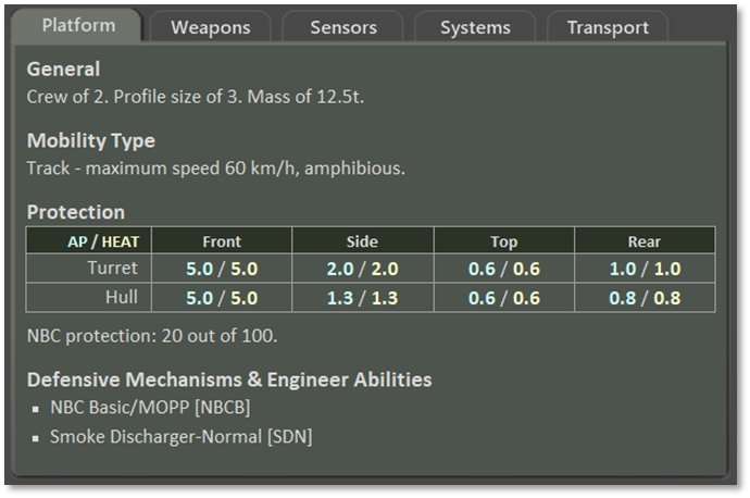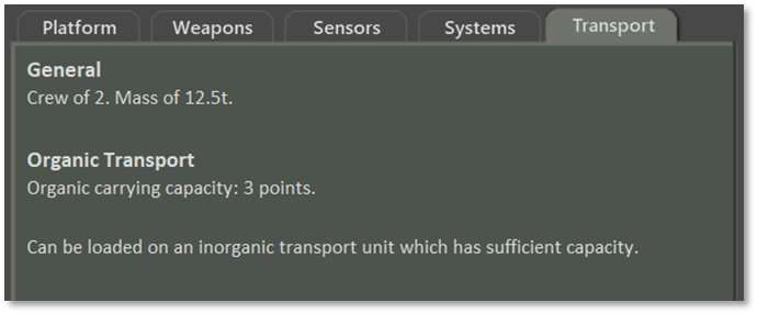 The Transport tab shows all transport capabilities of a platform. It first lists general information including the crew size and mass, followed by Organic Transport capacity. For the tracked armored personnel carrier pictured below, the Carrying Capacity is noted: