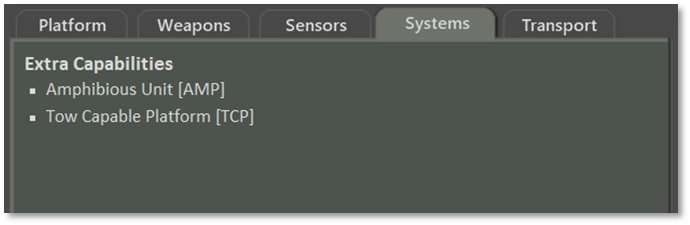 The Systems tab notes any other systems that provide a unique capability not already covered in the other tabs. Examples include being amphibious or tow capable, as shown in the image below.