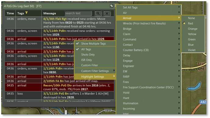 A series of messages are recorded to the Logs as the game unfolds. Both the Time in game and Tag (type of message) are listed with the Message. On the face of it, radio logs/unit logs don’t look like much has changed. On closer inspection, you will see that all messages are now Tagged (instead of just some of them as before), unit names are highlighted, and locations are given subtle highlights (just bold, no color). Unit names and hex locations are now hyperlinked to scroll the map to those hexes when clicked (if not already in frame).