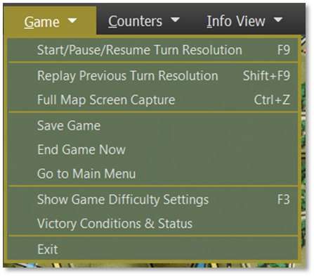 The Game Menu covers functions that relate to the overall playing of the scenario.