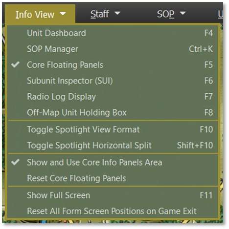 Core Floating Panels [F5] – Shows (when checked) or hides (when unchecked) the four primary panels that are located along the right edge of the screen by default. These are Game Control, Commander, Spotlight, and Mini-Map Panels. This is on by default. These are covered in detail in Section 13 below.