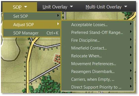 SOPs (Standard Operating Procedures; pronounced ess-oh-PEEZ in short form) are unit instructions on how to behave in certain situations on the battlefield. This menu bar item provides a means to adjust SOP characteristics for selected units or to set SOPs based on the type of unit. It also provides a shortcut to load the SOP Manager.
