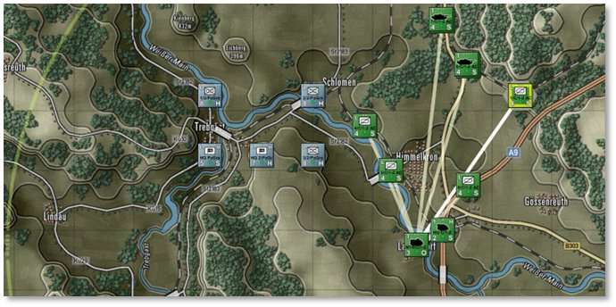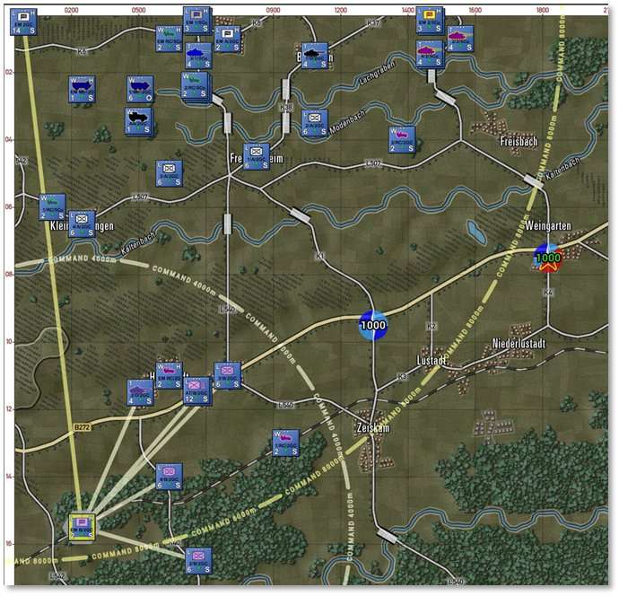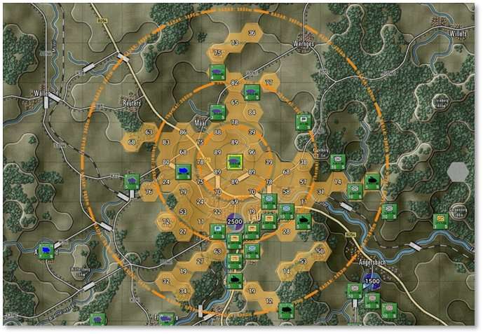 The above image also shows a darker line connecting the selected HQ to the higher-level HQ while lighter lines extend from the selected HQ to its lower-level subordinate units. The HQ command ranges are drawn as circles which are also shaded by superiority (darker = higher up).