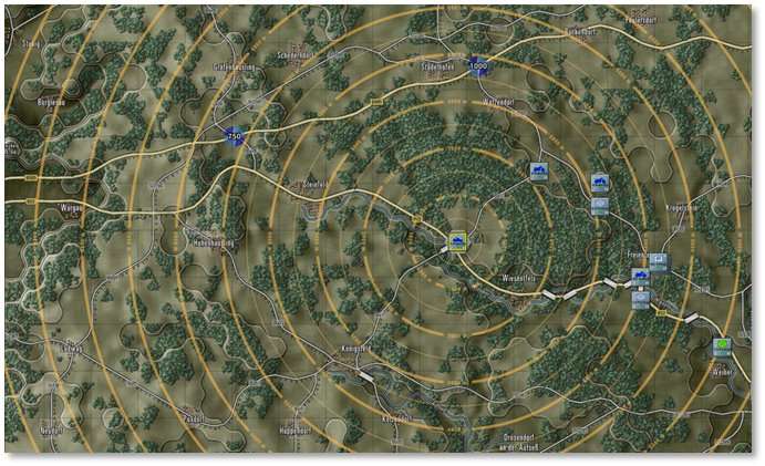Selecting this option brings up the Chain of Command ring overlay. Chain of Command refers to how orders are given and received by units and headquarters (HQ). As shown below, the highest HQ shows lines of command to the next lower-level HQ when selected. Solid lines indicate units in range. Dashed lines indicate either a subordinate HQ or a unit that is out of range. The HQ command ranges are drawn as circles. Units outside of the command range face additional delays in orders and reduced resupply. Some units, like recon units, can operate at full capacity at any range.
