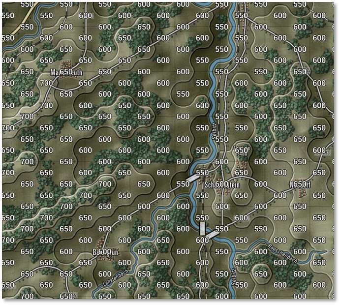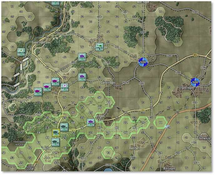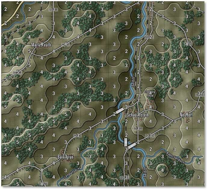 The numbers in the hexes represent the visual capabilities of that hex. Higher numbers mean a better chance to Spot enemy units from those hexes. Hexes inside the hard outline are within weapons range. See Section 24 below for more details on LOS and the Spotting of units.