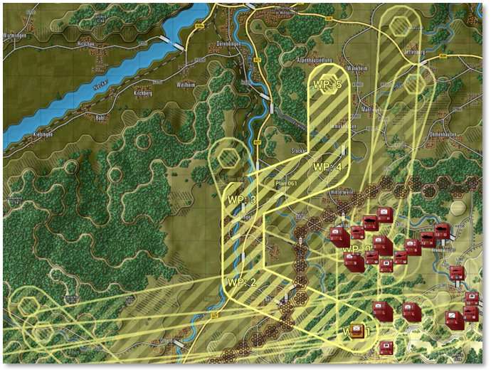 Selecting this option displays simplified routes for all planned transport missions that currently exist (in progress or planned). This makes it easier to visualize where the movement corridors are placed on the map in relation to each other, including the load/unload locations (marked by a small outlined hex with diagonal hatch in the opposite direction), as shown below. This overlay is yellow for air and teal for land, with thick diagonal hatches that forms a wide path from waypoint to waypoint. The currently selected unit’s path is a slightly brighter yellow/teal and each waypoint is labeled with WP followed by the corresponding number, up to six. Transport units may adjust their routes between waypoints as necessary so these corridors serve as references only.