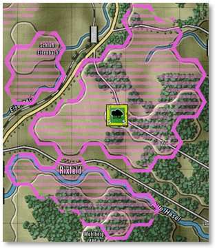 Second, selecting a unit with an air defense gun system (Flak; see Section 25.5 below), shows hex coverage the red overlay as well as a second overlay of horizontal hatched pink lines. The range of the selected unit has a thick hex-edge outline, as shown in the image below. This is the same style of Flak overlay as described in the subsection above.
