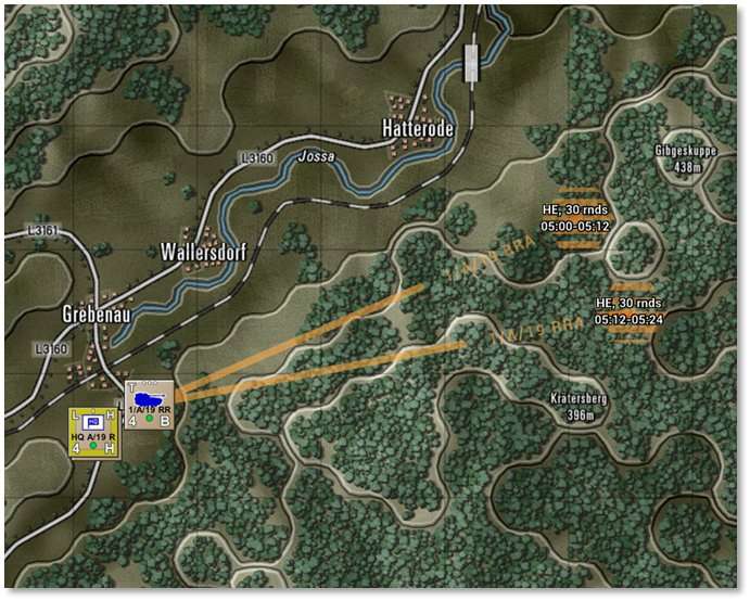 Selecting this option brings up an overlay showing all of the currently plotted fire missions. An orange solid line goes from each firing unit to the target hex(es). The target hex(es) state the type of mission (Smoke, Chemical, HE: High Explosive, or ICM: Improved Conventional Munitions), the number of rounds to be fired, and the time the mission starts. Lines are drawn for off-map assets based on their off-map locations and target hexes.