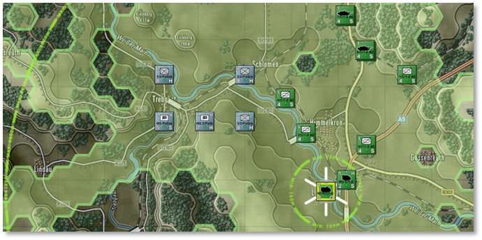 In the next picture, one of the subordinate units has been selected. A darker line extends to that unit’s HQ and a darker circle shows the extent of that HQ’s command radius. Selecting other subordinate units will show a similar relationship to their local HQ.