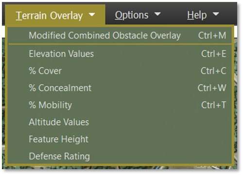 The Terrain Overlay Menu has several useful overlays covering various factors of the map and terrain. The most important from a planning aspect is the MCOO (pronounced mah-KOO) or the Modified Combined Obstacle Overlay. Most of the other terrain feature values are permanently visible in the Status Bar as the mouse hovers over different hexes (see Section 12.2 below).